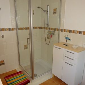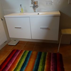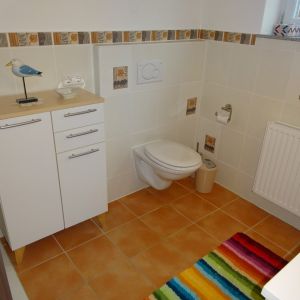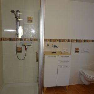 WC, Dusche, Tageslicht, Handtücher, gefliester Boden