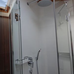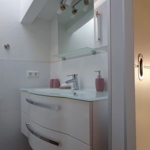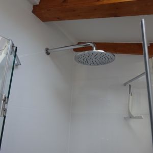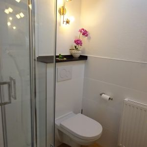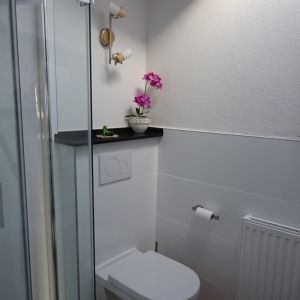 WC, Dusche, Tageslicht, Handtücher, gefliester Boden